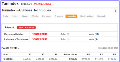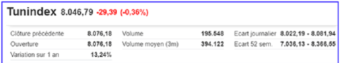 Au niveau graphique, le TUNINDEXperd près de 30 pts (-0.36%) et semble vouloir se complaire avecune résistance à 8050 points.