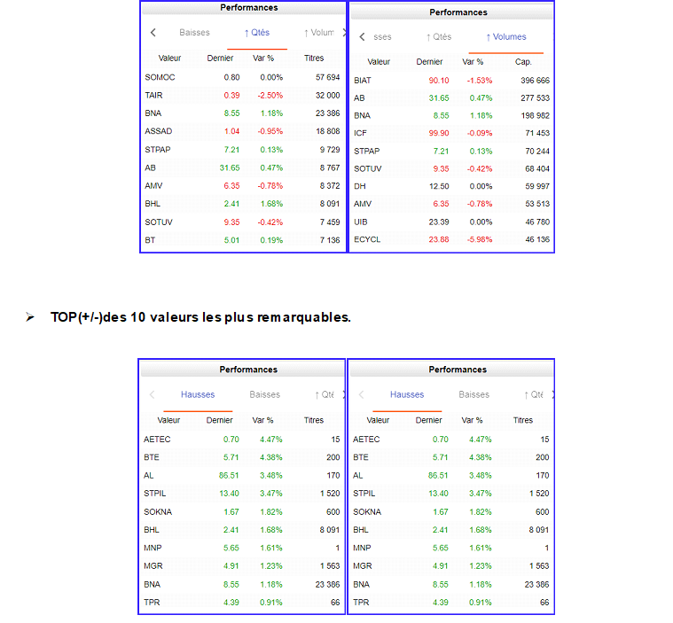 - Sur 10 valeurs quantitativement actives, 5 sont à la hausse, contre 4 à la baisse et 1 inchangée.