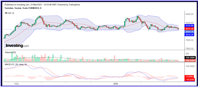 En tout état de cause, on retiendra que les franchissements successifs (+/-) des seuils entre les 8050 pts et les 8100 pts et le maintien du Tunindex dans un chenal 8000-8050 pts serait globalement positif pour un franchissement de la résistance à 8050 pts, avec une fiabilité moyenne, à l’horizon de fin mars.