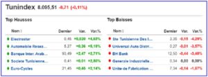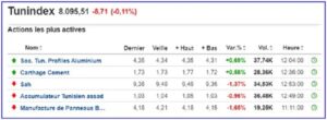 Le TUNINDEX a clôturé la séance du mardi avec une baisse de 0.11% en cédant plus de 8.7 points d’indice et clôturer à 8095.51 pts, en franchissant à la baisse le seuil hautainement symbolique des 8100 pts.