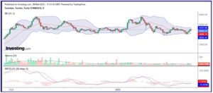 D’un point de vue graphique, on retiendra que le TUNINDEX, en mode valse musette, se retrouve à la marge de seuil symbolique à 8100 pts,dans la zone médiane des Bandes de Bollinger rétrécies, avec une propension la consolidation, comme le matérialise la dernière bougie du graphique en chandeliers ci-dessus.