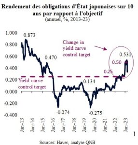 Fin décembre 2022, les responsables de la BoJ ont décidé d’entamer une transition prudente mais historique vers une politique monétaire radicale et ultra-légère. La mesure a consisté à modifier en douceur l’objectif de politique monétaire fixé pour le rendement des obligations de l’État japonais à 10 ans (JGB), en le faisant passer d’un plafond de 25 points de base (pb) à 50 pb. Ce changement est intervenu en raison d’une inflation supérieure à l’objectif et en accélération, ainsi que des pressions exercées par les mesures rapides de resserrement monétaire dans d’autres regionsdu monde.