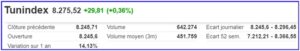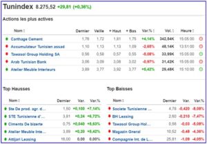 Après la timide hausse d’hier, le TUNINDEX progresse très confortablement ce mardi, gagnant 0.36% à 8275.52 points à la clôture de la bourse de Tunis.