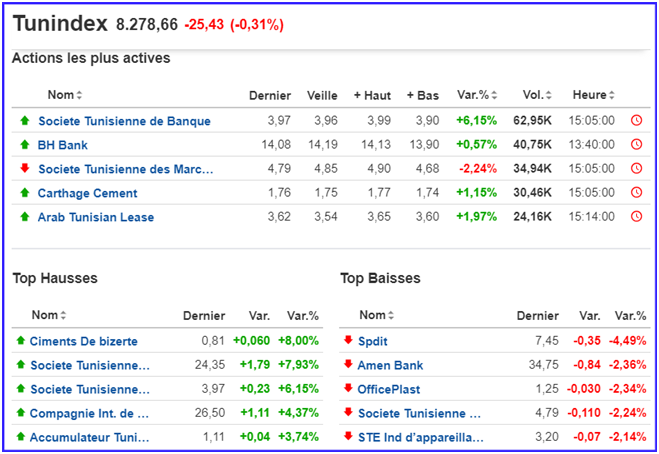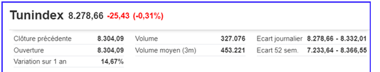 Le TUNINDEX finit la semaine en cédant plus de 25 pts(-0.31%), juste à la marge (-) du seuil symbolique des 8280 points.