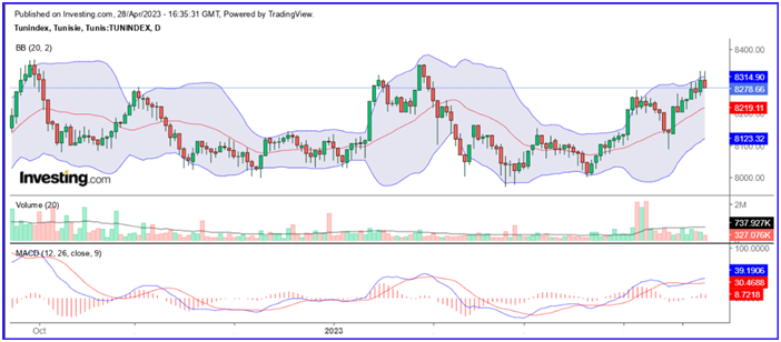 Le TUNINDEX, en collant àson seuil symboliqueà8280 pts eten-deçà de son point pivot, se positionne encore dans la zone supérieure du canal 8250-8300 pts, avec un :