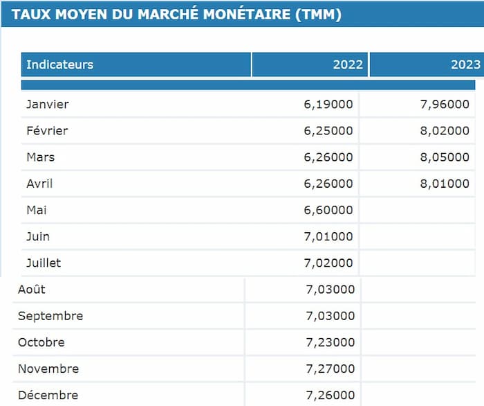 Selon les données de la Banque centrale de Tunisie (BCT), le taux moyen du marché monétaire (TMM) du mois d’avril 2023 s’établit à 8,01%. Et ce, après un taux de 8,05% enregistré au mois de mars 2023.