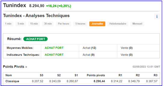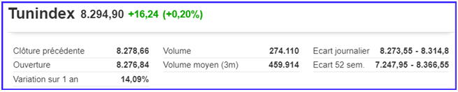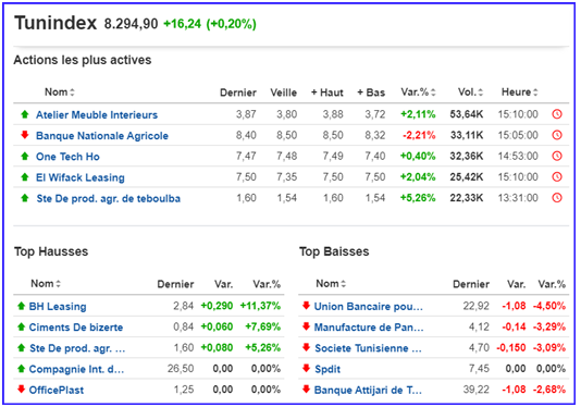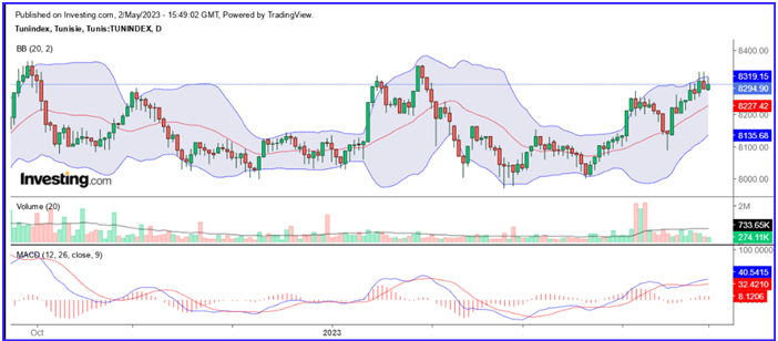Après la timide correction de vendredi à la clôture du mois d’avril, pour prises de bénéfices, le TUNINDEX reprend sa progression très confortablement ce mardi, en gagnant 16.24 points (+0.20%) à 8294.90 points à la clôture de la bourse de Tunis.