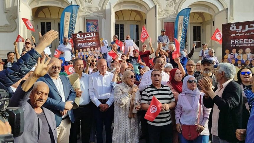 Le Front de salut national a organisé, samedi, une manifestation, à Tunis, en solidarité avec les personnes arrêtées sur fond d’accusations de complot contre la sûreté de l’État et de corruption.
