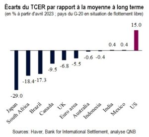 Le dollar s’est déjà déprécié de près de 5 % par rapport aux principales devises des pays émergents depuis la fin de l’année dernière. Il est important de noter que, malgré la modération de la force du dollar au cours des derniers mois, le taux de change effectif réel (TCER) du dollar – un taux de change corrigé de l’inflation et pondéré en fonction des échanges commerciaux – continue d’indiquer une surévaluation de 15 % de la monnaie américaine par rapport à sa tendance à long terme. Le TCER est souvent utilisé pour déterminer la « juste valeur » des différentes monnaies, car il tient compte des changements dans la structure des échanges entre les pays ainsi que des déséquilibres économiques sous la forme d’inflation et de différentiels d’inflation.