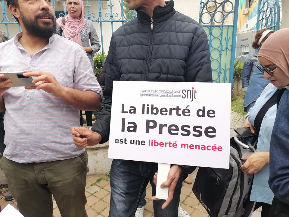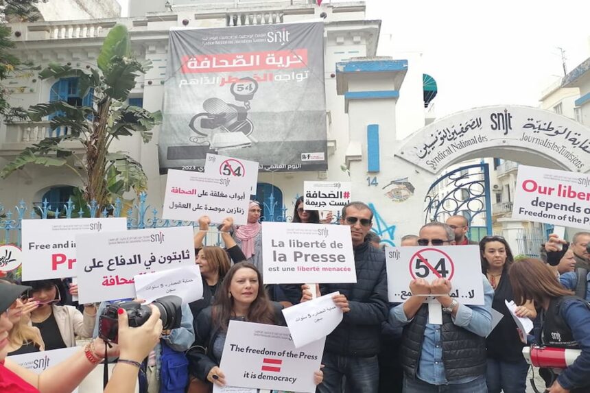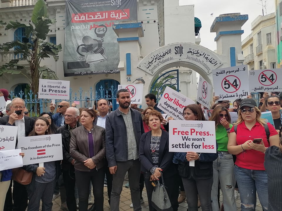 Le Syndicat national des journalistes tunisiens (SNJT) a organisé jeudi 18 mai 2023 un « rassemblement de colère », devant le siège du syndicat. Et ce, pour dénoncer la condamnation de la journaliste Khalifa Guesmi à cinq ans de prison. Après le verdict prononcé par la Cour d’appel de Tunis. Reportage photos et vidéos.