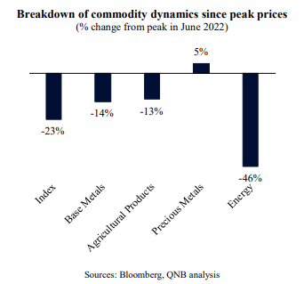 Premièrement, les prix des matières premières semblent indiquer une nouvelle décélération de l’économie mondiale. La hausse des taux directeurs, les retraits de liquidités, la limitation des dépenses budgétaires et la baisse des revenus disponibles due à l’inflation modèrent déjà la demande globale, entraînant un ralentissement de l’activité. Cela se traduit par une correction plus prononcée des produits de base hautement cycliques, tels que l’énergie et les métaux de base. Les prix du pétrole brut Brent, bien qu’encore légèrement supérieurs aux niveaux d’avant la pandémie, ont chuté de 38 % par rapport à leur récent sommet.