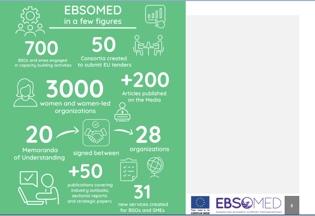 Ainsi, le projet Ebsomed a contribué à améliorer la capacité de gestion des organisations de soutien aux entreprises. Et ce, avec plus de 7000 représentants bénéficiaires y compris hommes, femmes, entreprises, organismes officiels ( Cepex, l’APII, 279 représentants des acteurs du secteur privé, institution financière ou OSE (Organisation de support des entreprises mobilisées ) et la participation de 3 000 femmes entrepreneures et organisations dirigées par des femmes.