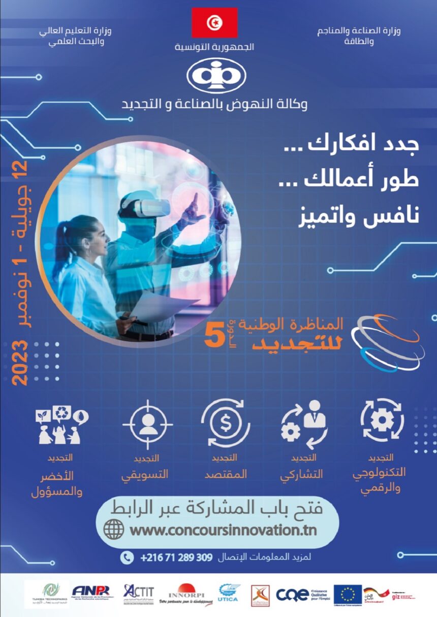 L’Agence de Promotion de l’Industrie et de l’Innovation (APII) annonce, mercredi 12 juillet 2023, l’organisation de la 5ème édition du Concours national de l’innovation sous l’égide du ministère de l’Industrie, des Mines et de l’Energie, en collaboration avec le ministère de l’Enseignement supérieur et de la Recherche scientifique, et en partenariat avec l’Union tunisienne de l‘industrie, du commerce et de l‘artisanat (UTICA) et l’agence de coopération allemande GIZ.