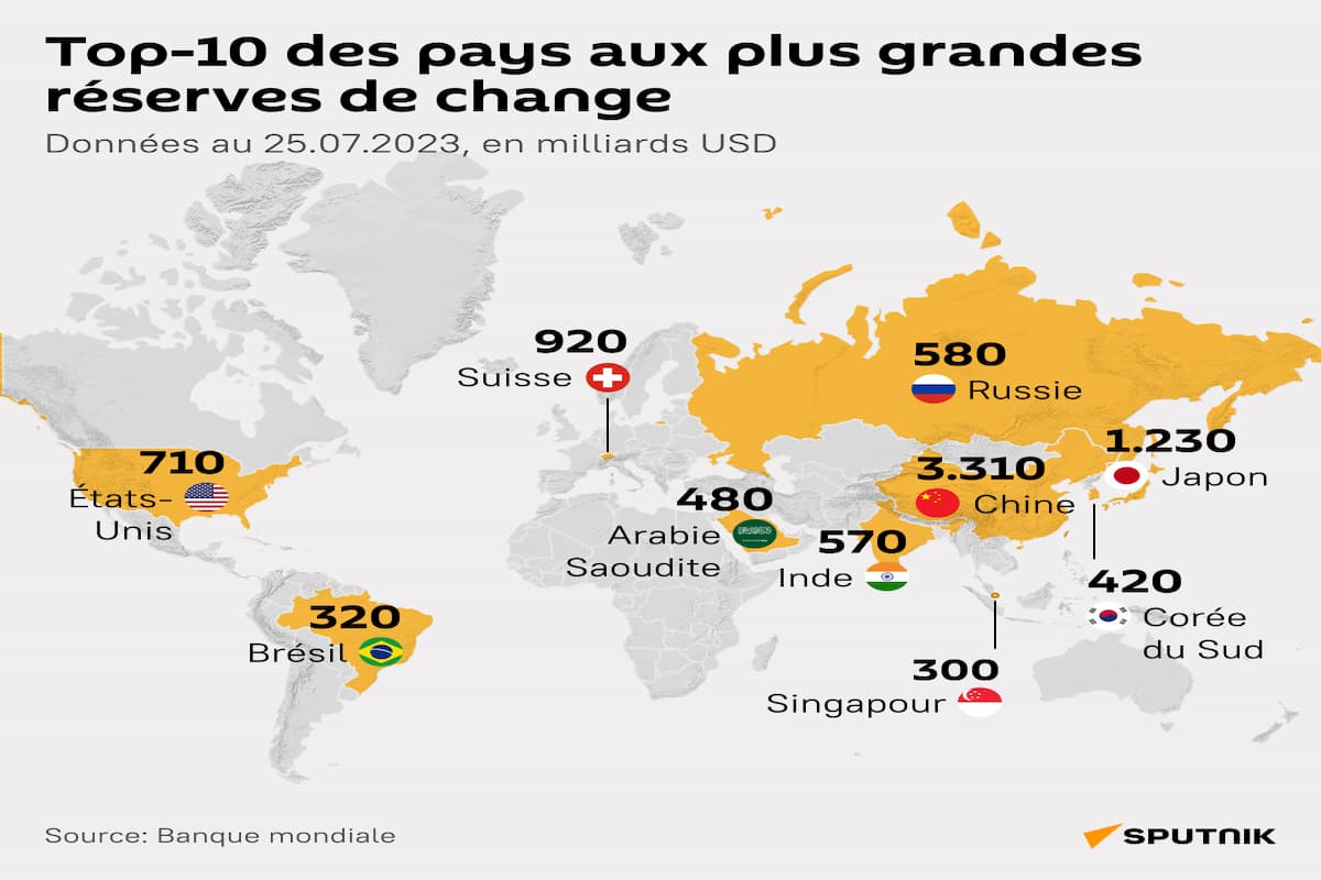 Les sept autres pays du Top 10 sont, par ordre d’importance, la Russie (580 milliards de dollars), l’Inde (570 milliards de dollars), la Corée du Sud (420 milliards de dollars), l’Arabie saoudite (480 milliards de dollars), le Brésil et Singapour (300 milliards de dollars).