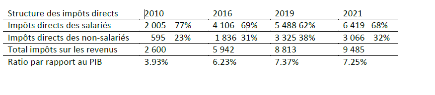 lors que les recettes au titre des impôts sur les non-salariés augmentent de 16% en moyenne par an. La structure de l’impôt sur les revenus s’en trouve modifiée avec une augmentation sensible de la part des non-salariés ; celle-ci passe de 23% en 2010 à 32% en 2021.