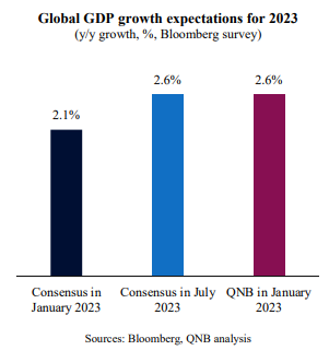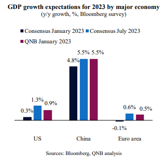 Mais cela s’est avéré trop pessimiste, comme nous l’avons souligné dans notre Commentaire économique du 1er janvier 2023 : « … alors que nous entrons dans la nouvelle année 2023, on peut dire sans risque de se tromper qu’un grand nombre d’événements négatifs ont déjà été pris en compte et compris. Selon nous, la précédente série de révisions à la baisse a conduit à un pessimisme exagéré quant à la baisse des perspectives de croissance. Nous prévoyons donc une croissance de l’économie mondiale de 2,6 % en 2023, toutes les grandes économies se développant à un rythme plus rapide que ne le prévoient la plupart des analystes.
