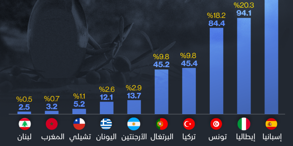 L’Espagne est en tête de liste des plus grands exportateurs mondiaux d’huile d’olive au cours de la saison 2022/2023. Avec une part de marché de 31 % du total des exportations mondiales et un volume d’exportation d’environ 147 000 tonnes.