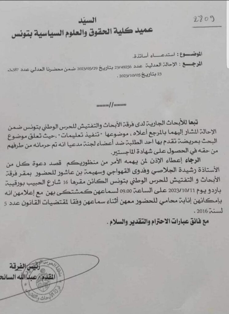 Une histoire invraisemblable se déroule à la faculté de droit de Tunis. Un étudiant a porté plainte contre le comité scientifique, car il n’a pas reçu son diplôme de master, et les membres du comité (qui sont des professeurs de droit) ont été convoqués par la Garde nationale. L’accusation porte sur la privation de cet étudiant de son droit à la réussite. C’est ce qu’a révélé Mouna Kraïem Dridi, professeur et constitutionnaliste, via sa page Facebook.