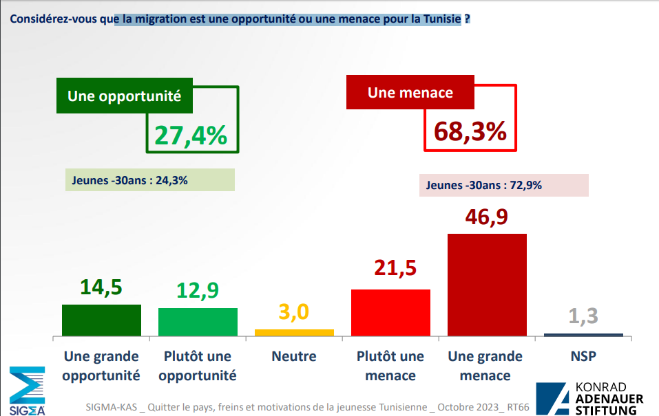 Sur un autre volet, la migration est-elle une opportunité ou une menace pour la Tunisie? A cette interrogation, la réponse semble contradictoire. Puisque 68,3 % des Tunisiens voient d’un mauvais œil l’idée de partir tout en mettant l’accent sur une menace réelle. Alors que 27,4 % des Tunisiens pensent qu’il s’agit d’une opportunité.