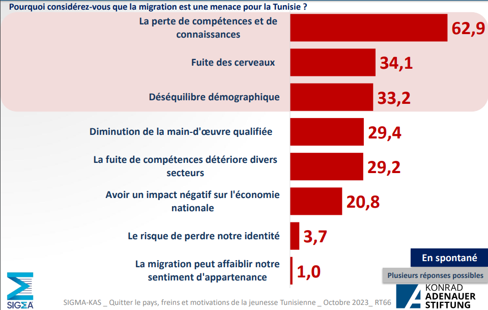 En outre, 62,9 % des sondés estiment qu’il s’agit de la perte de compétences et de connaissances et 34,1 % des sondés pensent à la fuite des cerveaux.