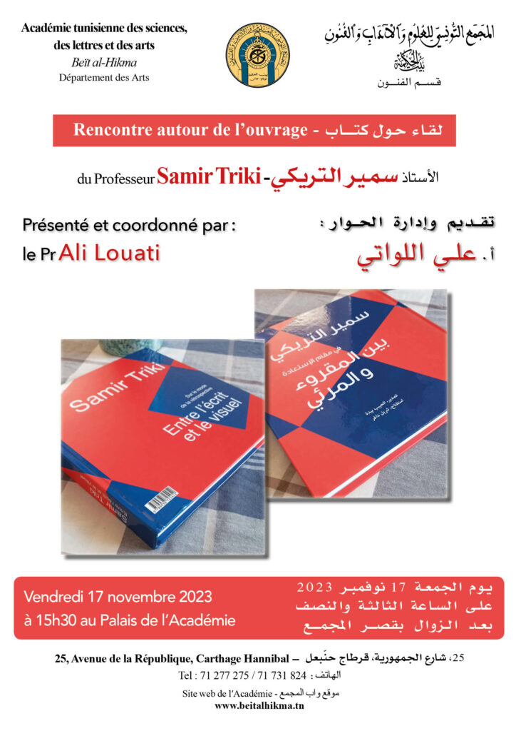 Le vendredi 17 novembre, l’Académie abritera une rencontre littéraire autour de l’ouvrage de Samir Triki «Entre l’écrit et le visuel ». La rencontre sera présentée par le Professeur Ali Louati.