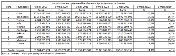 Au-delà de cet aspect « conjoncturel », on observera aussi que les importations européennes d’habillement de 2023 sont à peine supérieures à celles d’avant-Covid et que certains fournisseurs tels que la Chine, le Cambodge et le Maroc ne sont même pas encore parvenus à leur niveau de 2019.