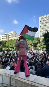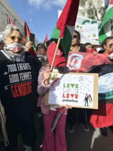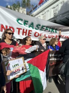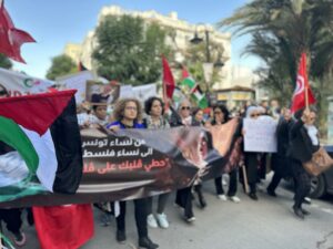 Plus d’une centaine de femmes se sont rassemblées en solidarité avec les femmes palestiniennes, portant le slogan « Des femmes de la Tunisie aux femmes de Palestine », lors de l’après midi du samedi 25 novembre 2023. Ainsi les Tunisiennes ont défilé dans le centre-ville de Tunis en solidarité envers les Palestiniennes.