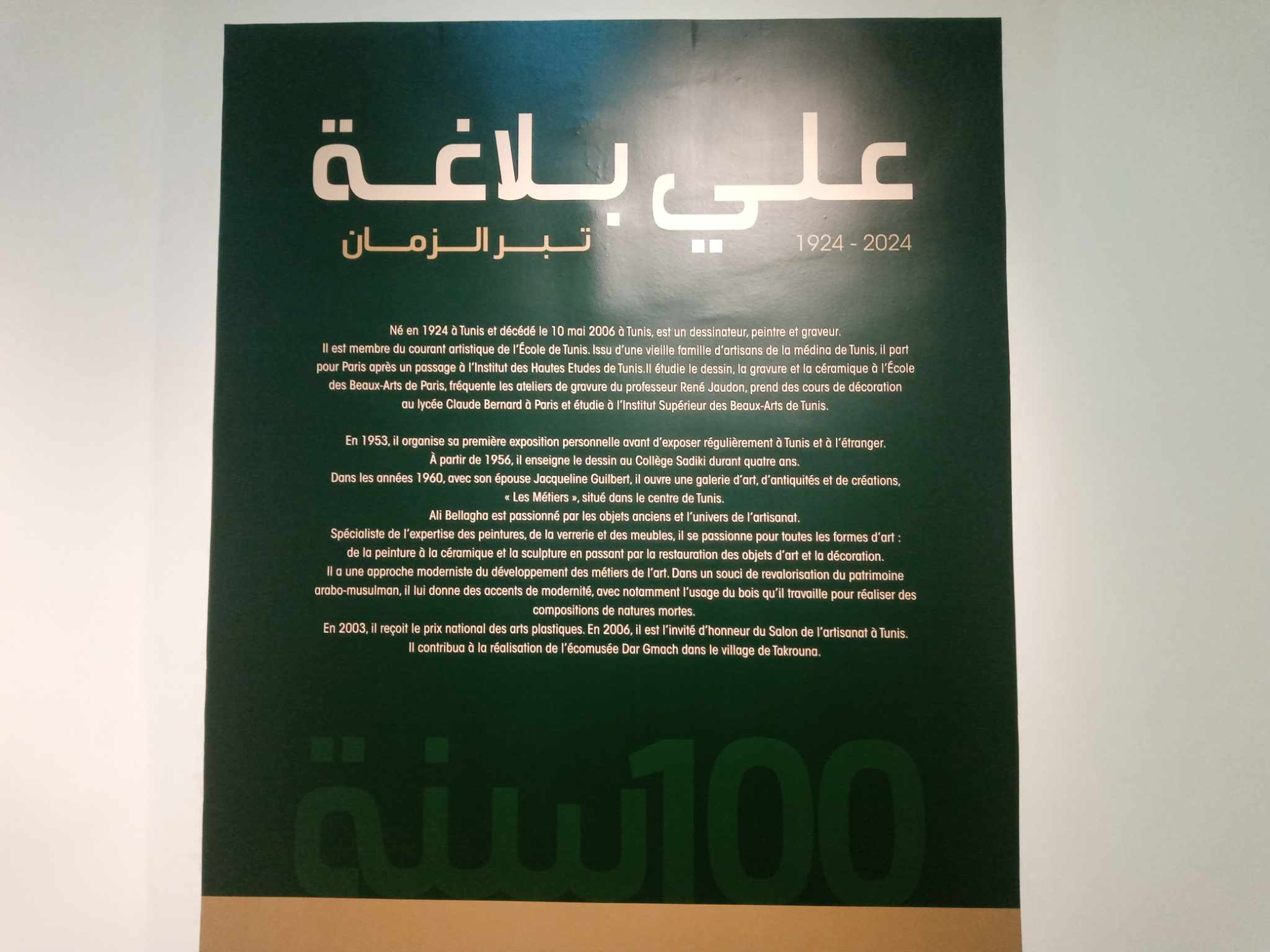 La Maison des Arts du Belvédère célèbre le centenaire de la naissance de l’artiste plasticien Ali Bellagha (1924-2006) avec l’exposition-hommage « Ali Bellagha, l’or du temps, témoin de son temps », inaugurée le 13 janvier.