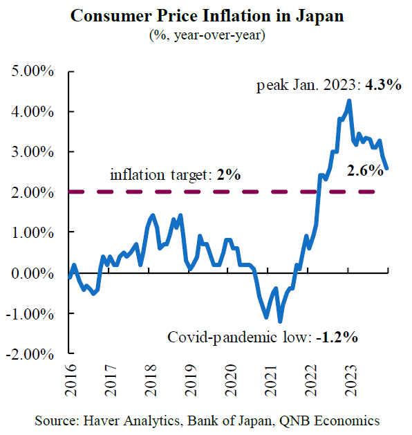 Tout d’abord, la baisse persistante des taux d’inflation a ravivé les craintes que le Japon ne revienne à un scénario durable avec une inflation nettement inférieure à l’objectif. Après avoir atteint le pic de 4,3 % au début de 2023, l’inflation a commencé à chuter fortement à mesure que l’impact de la dépréciation du yen s’est estompé, atteignant 2,6 % dans les dernières données de décembre de l’année dernière.