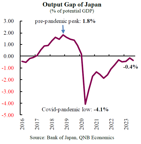 Par ailleurs, en dépit d’une reprise notable depuis le creux de la vague observé lors de la pandémie de Covid, la demande globale demeure inférieure à la capacité de production à long terme de l’économie. La Banque du Japon utilise les données relatives au capital et au travail afin d’élaborer la statistique de « l’écart de production », qui mesure le niveau de la demande par rapport aux possibilités de production de l’économie. Cette mesure est suivie de près par la BoJ, étant donné que des écarts de production négatifs persistants mettent en garde contre des pressions déflationnistes potentielles. Durant la pandémie de Covid, l’écart de production s’est effondré à -4,1 %, annonçant la chute de l’inflation en zone négative.Après 14 trimestres consécutifs dans la zone négative, la demande ne s’était pas encore totalement rétablie à la date de la dernière publication du T3-2023, où elle était encore inférieure à la capacité de production de 0,4 %. Le tremblement de terre qui a frappé le Japon lejour de l’an a renforcé les inquiétudes, alors que les indicateurs avancés pointent vers un nouveau ralentissement de l’activité économique. Ainsi, les perspectives globales de croissance économique du Japon demeurent sombres, fournissant à la BoJ un argument supplémentaire pour différer un changement de taux d’intérêt directeur.