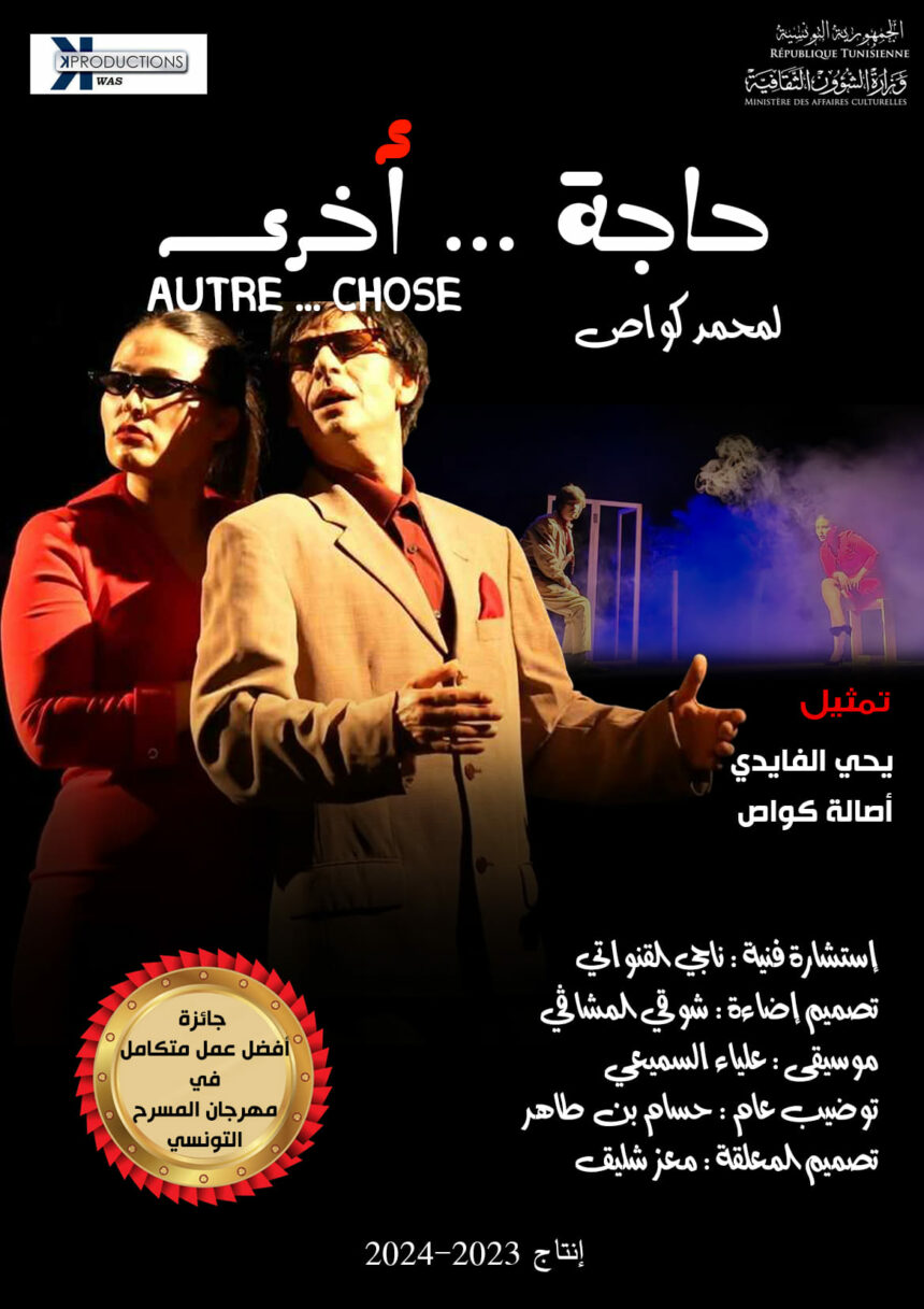 La pièce de théâtre tunisienne « Autre chose » écrite et mise en scène par Mohamed Kouas vient de remporter trois grand prix des Journées théâtrales arabes de Sétif. Lesquelles se sont déroulées dans leur deuxième édition dans la ville algérienne de Sétif, du 14 au 18 février 2024. Il s’agit des Prix de « la meilleure mise en scène », de « la meilleure scénographie » et de la « meilleure interprétation masculine » qui a été décerné à Yahia El Faidi pour son rôle « Man ».