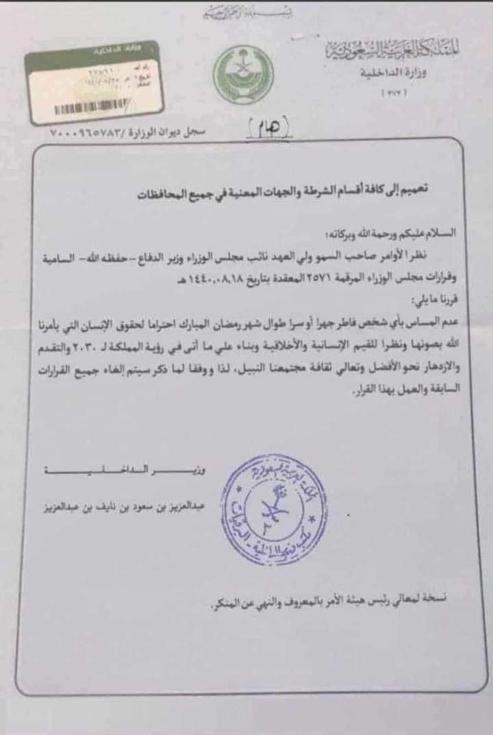 Un pas en avant pour les Saoudiens, puisque jeûner ou ne pas jeûner ne pose aucun problème à Riyad. De ce fait, les autorités saoudiennes ont par la voie de leur ministre de l’Intérieur ont décidé de mettre fin à la persécution des non-jeûneurs, même si pour les Saoudiens, il s’agirait d’une transgression du pilier de l’islam.
