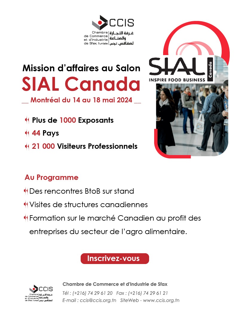 Une mission d’affaires au Canada sera organisée par la Chambre de commerce et d’industrie de Sfax (CCIS) en partenariat avec l’ambassade du Canada à Tunis, du 14 au 18 mai 2024, à l’occasion de la tenue du Salon de l’industrie agroalimentaire canadienne « SIAL Canada » qui aura lieu à Montréal du 15 au 17 du même mois.