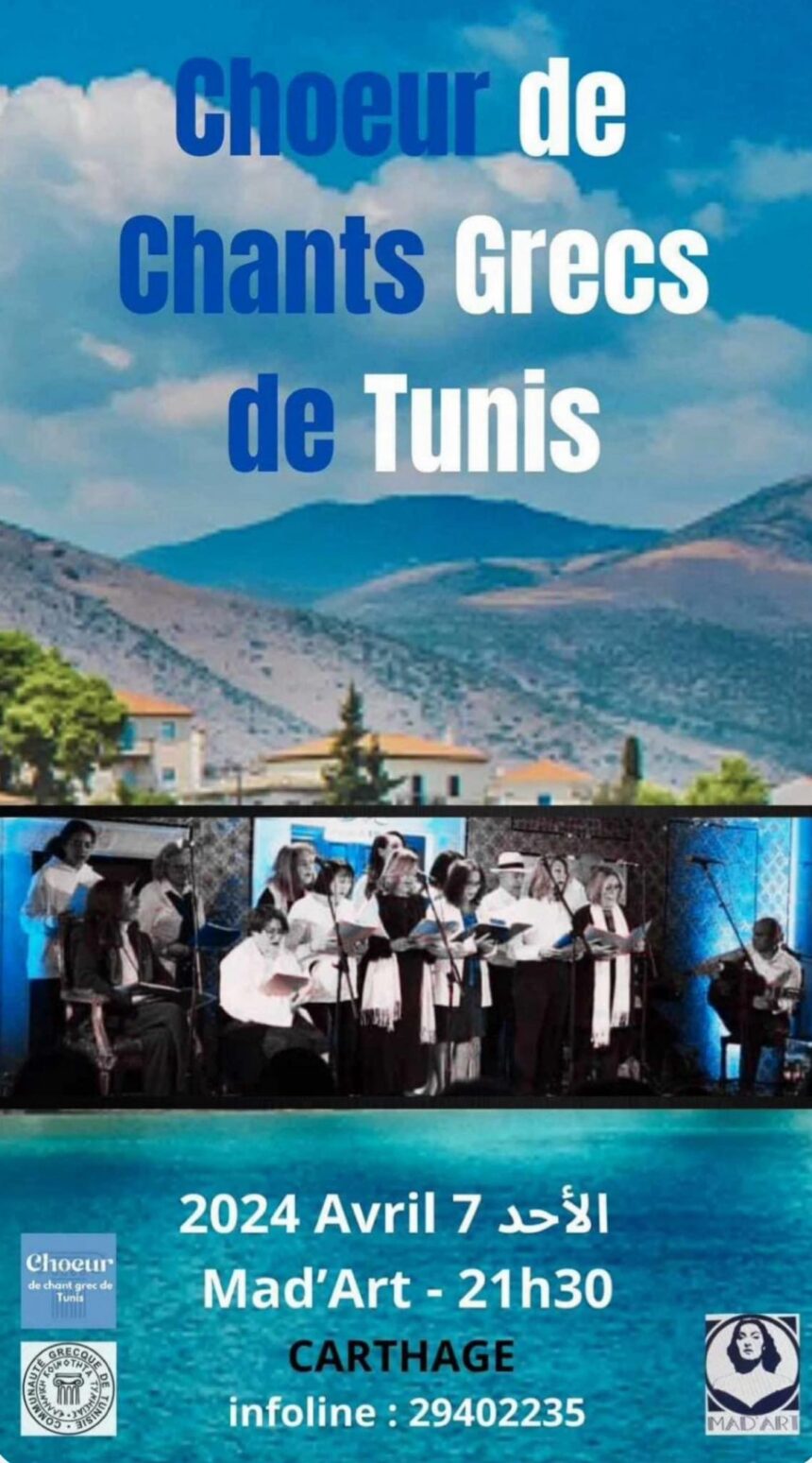Au programme, Théodorakis, Hatzidakis, Vamvakaris, des airs connus et moins connus. Le chœur a donné un très beau spectacle à Dar Lasram pour le festival de la Médina. Ce dimanche, c’est à Madart qu’il se produit. Au programme, la Grèce des îles, de la nostalgie, de la résistance, de l’amour, de la jalousie. La Grèce dans sa splendeur. Joli rendez-vous musical pour la veille de l’Aïd.