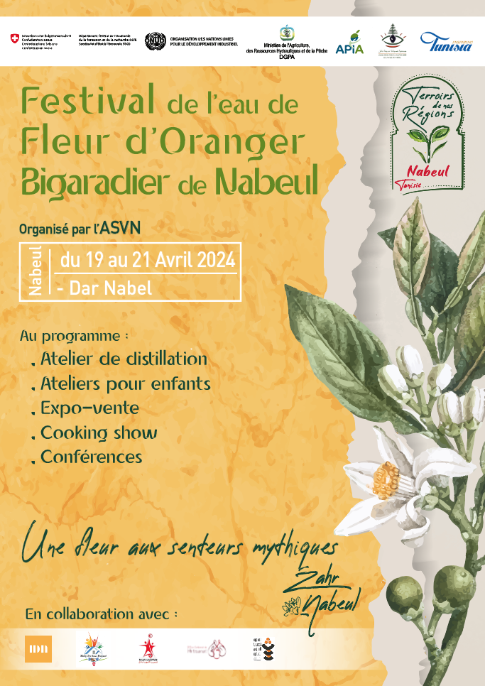 Les participants auront aussi l’occasion de visiter le Festival de l’eau de fleur d’oranger à Dar Nabeul (Médina de Nabeul) où l’Association de sauvegarde de la ville de Nabeul (ASVN) avec ses partenaires organisera des expositions-ventes, des ateliers thématiques sur les produits dérivés de la fleur d’oranger ainsi que des dégustations de boissons et de plats salés et sucrés typiquement de la région à base de fleurs d’orangers.