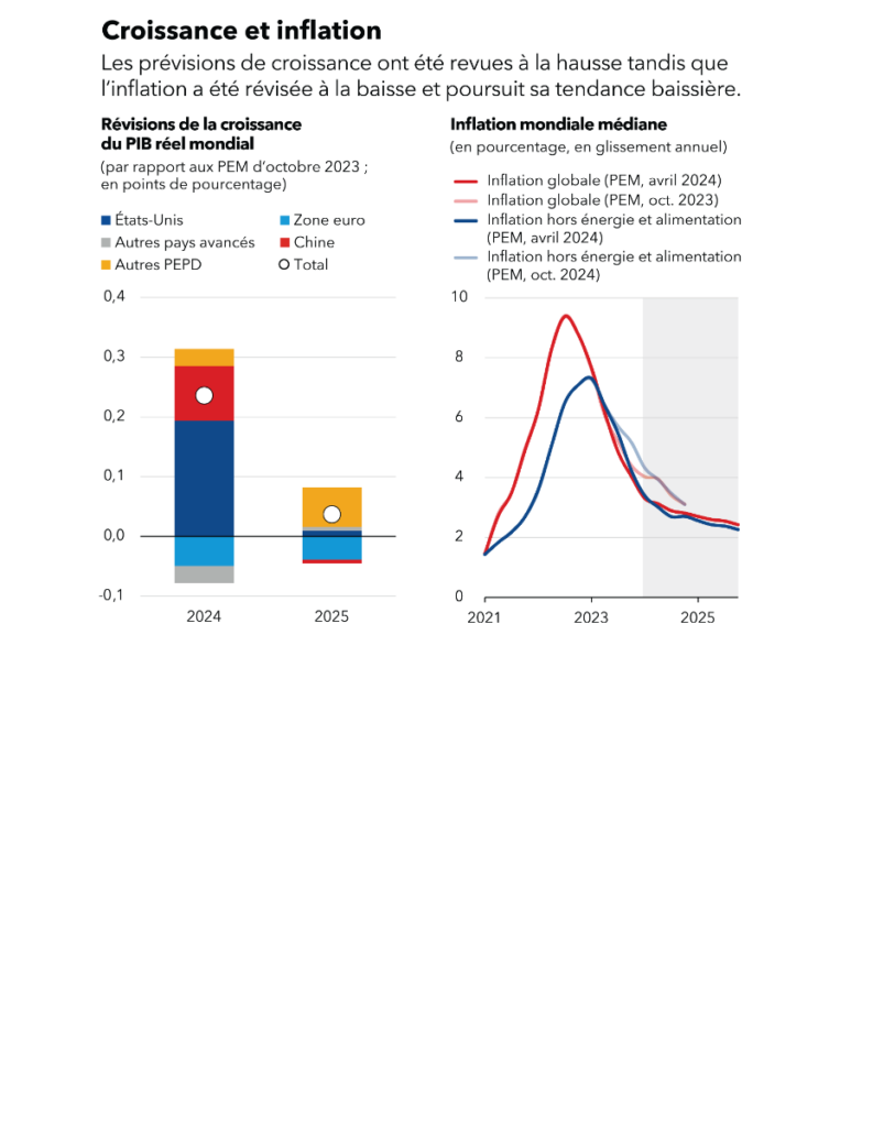 D’après les projections de la nouvelle édition des Perspectives de l’économie mondiale, la croissance pour cette année et la suivante restera stable autour de 3,2 %. Tandis que le taux médian d’inflation globale baissera, passant de 2,8 % à la fin de 2024 à 2,4 % à la fin de 2025. La plupart des indicateurs continuent d’annoncer un atterrissage en douceur.