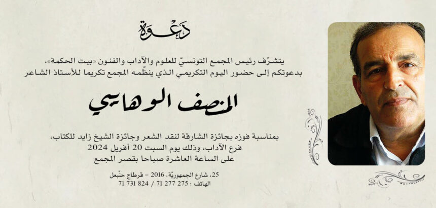 L’Académie tunisienne des sciences, des lettres et des arts (Beit Al-Hikma) honore le poète Moncef Louhaibi à l’occasion de son obtention du prix Sheikh Zayed Book, et ce dans le cadre de la 20ème édition du Festival de la poésie arabe de Sharjah.