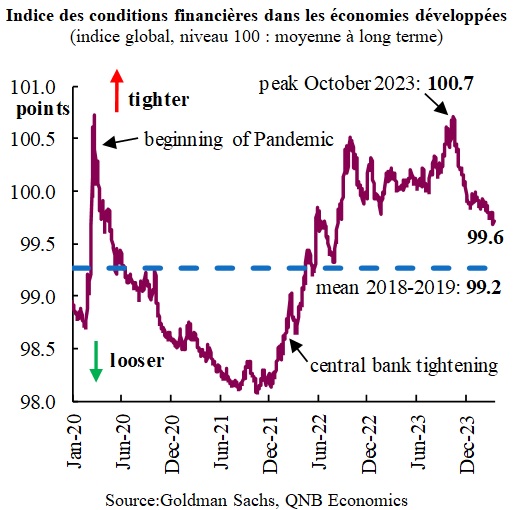 Ces politiques monétaires ont entraîné un resserrement des marchés financiers dans les économies avancées. Une mesure utile est l’indice des conditions financières (ICF) pour les économies avancées, qui fournit un indicateur utile en combinant des informations sur les taux d’intérêt à court et à long terme, ainsi que sur les écarts de crédit et les prix des actions. L’indice des conditions financières indique que les marchés étaient à leur plus haut niveau en octobre 2023. Toutefois, comme les taux d’inflation ont consolidé leur tendance à la baisse et que les prévisions d’inflation positives ont rassuré les analystes, les marchés ont commencé à assimiler la fin des cycles de resserrement monétaire et les conditions financières se sont améliorées. Selon nous, même si les conditions financières continueront à s’améliorer cette année grâce aux réductions des taux directeurs de la Fed et de la BCE, elles resteront restrictives au cours des prochains trimestres. Nous examinons les deux principaux facteurs qui appuient notre analyse.