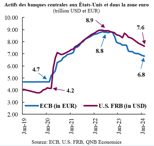 En second lieu, la BCE et la Fed continueront à drainer des liquidités dans les systèmes bancaires en revenant sur les expansions de bilans mises en place pendant la pandémie de Covid. Pour atténuer les conséquences de la pandémie, les banques centrales des économies avancées ont acheté de grandes quantités d’actifs financiers sur les marchés. Cette stratégie, appelée « assouplissement quantitatif » (QE), a été mise en œuvre pour injecter des liquidités dans le système financier et contribuer à la baisse des taux d’intérêt à long terme.