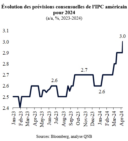 Toutefois, cette vision optimiste de l’inflation a été remise en question ces dernières semaines, les prix officiels pour janvier, février et mars 2024 ayant été plus élevés que prévu. En conséquence, la confiance du marché dans une conversion rapide de l’inflation à l’objectif de 2 % s’est affaiblie, ce qui suggère qu’il pourrait y avoir une lutte pour éroder la « dernière ligne droite » de l’inflation au-dessus de l’objectif. En fait, les prévisions du consensus de Bloomberg indiquent une augmentation de la projection médiane de l’inflation en 2024 à 3 % aux États-Unis. Il est important de noter que les prévisions du consensus impliquent également que l’inflation ne reviendra pas à l’objectif avant 2026.