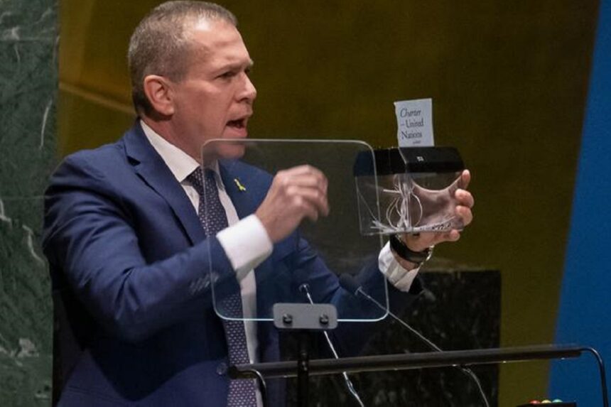 Cependant, le 10 mai 2024 restera dans les annales de l’ONU. Furieux que l’Assemblé générale ait voté à la majorité de 143 membres en faveur de la Palestine, l’ambassadeur d’Israël, Gilad Erdan, monta à la tribune de l’ONU équipé d’un mini broyeur, y plaça une copie de la Charte des Nations Unies et s’adressa à l’Assemblée avec toute l’arrogance dont il était capable : « J’ai déchiqueté la Charte des Nations Unies. » !!!