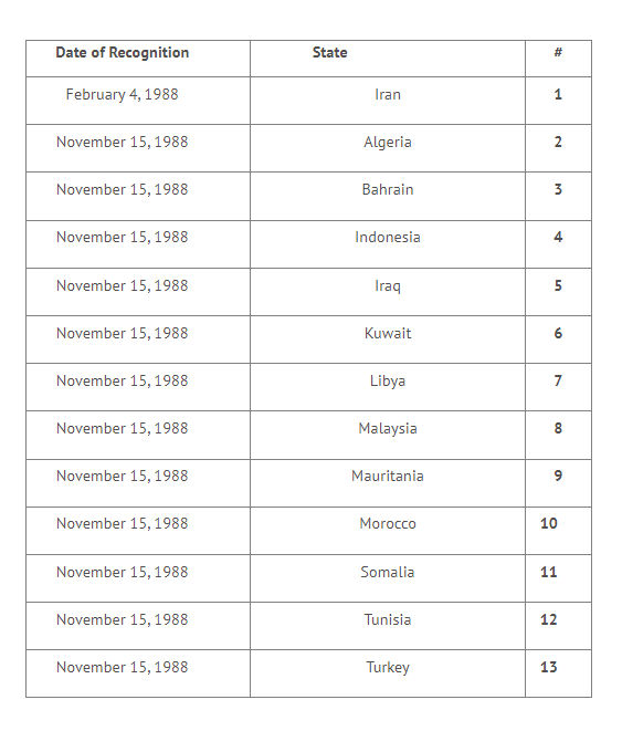 Vous trouverez ci-dessous la liste des pays qui reconnaissent officiellement l’Etat de la Palestine: