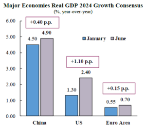Toutefois, les données publiées ont indiqué que l’économie reposait sur des bases solides. Les chiffres du PIB pour le premier trimestre 2024 ont montré que la consommation de services, qui représente une part importante de l’économie, a augmenté à un taux annualisé exceptionnel de 4 %, ce qui est nettement supérieur au rythme d’expansion de 2,3 % en 2023. Dans l’ensemble, les bilans sains des ménages et les marchés du travail robustes continuent de soutenir la consommation. En outre, les indicateurs avancés montrent que la décélération attendue de l’économie américaine se fera en douceur. En fait, le consensus actuel indique une croissance de 2,4 % pour cette année, à peine inférieure à la croissance de 2,5 % prévue pour 2023. L’amélioration des perspectives de la première économie mondiale a contribué de manière significative à l’amélioration des perspectives mondiales.