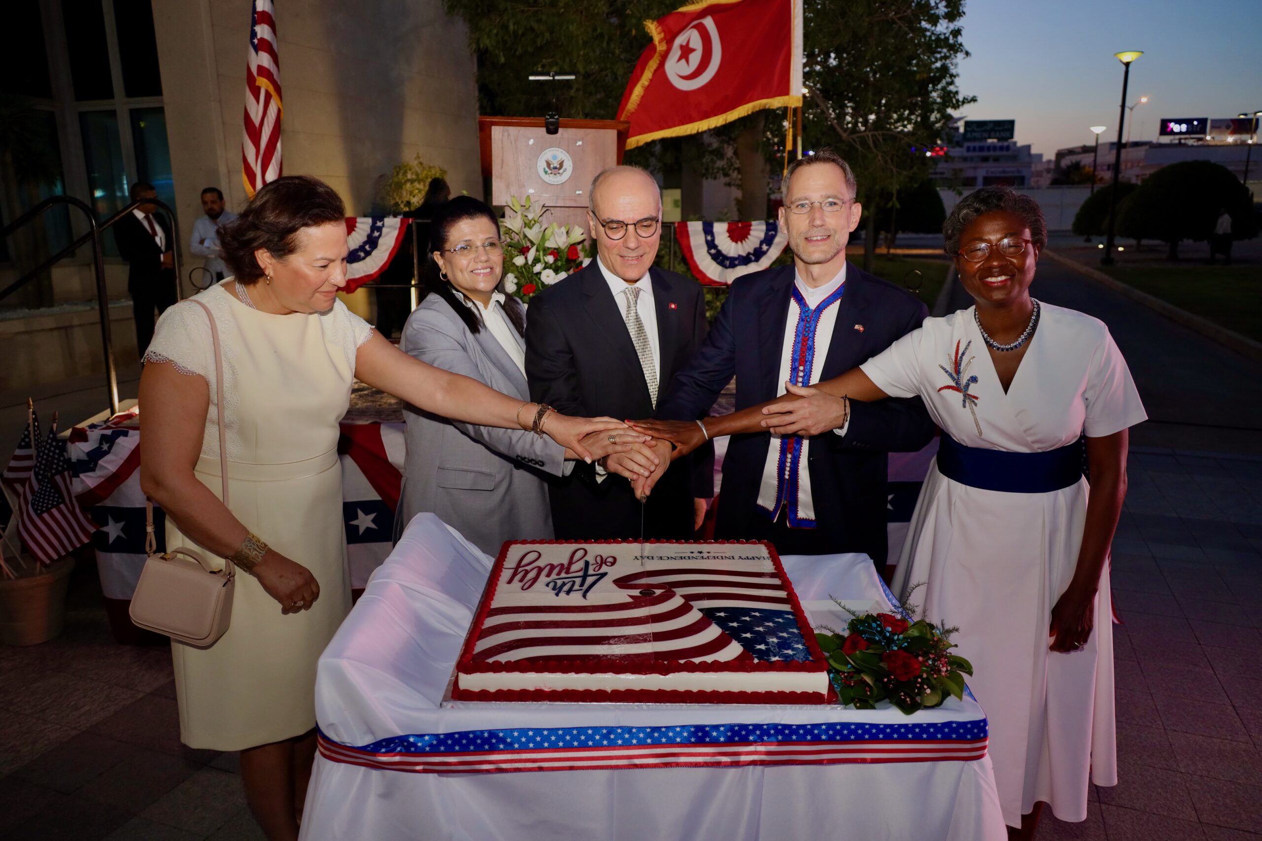 La veille du 4 juillet, Joey Hood, ambassadeur des États-Unis en Tunisie, et son épouse, Anne Lompo, ont accueilli la réception annuelle de l’ambassade à l’occasion du 248 e anniversaire de  la fête de l’indépendance. Parmi les invités, on trouvait notamment le ministre des Affaires étrangères, Nabil Ammar, et la ministre des Finances,  Sihem Boughdiri Nemsia.