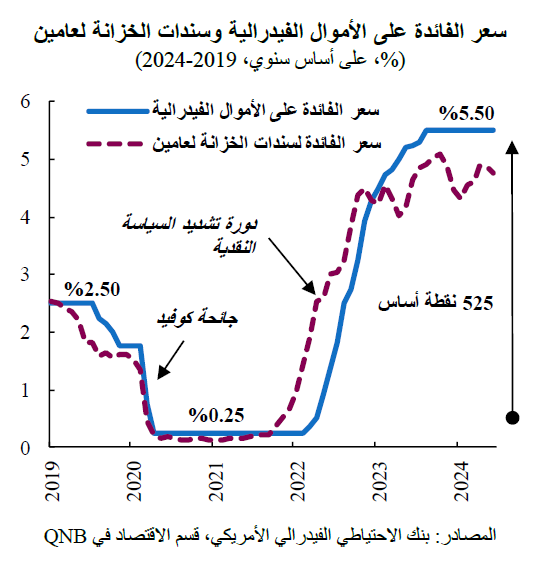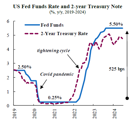 Taux des fonds fédéraux américains et bons du Trésor sur 2 ans (%, a/a, 2019-2024)