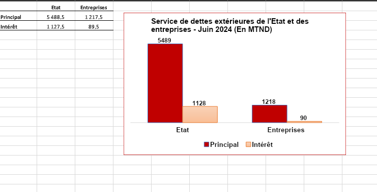 Cela nous donne un remboursement des dettes extérieures contractées par des entreprises privées ou publiques qui s’est élevé à 1 307 MTND, dont 1 217,5 MTND de principal et 89,5 MTND d’intérêts.
