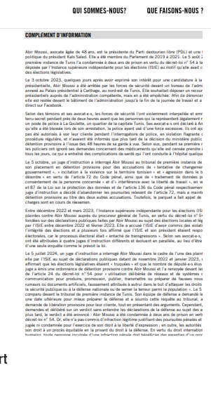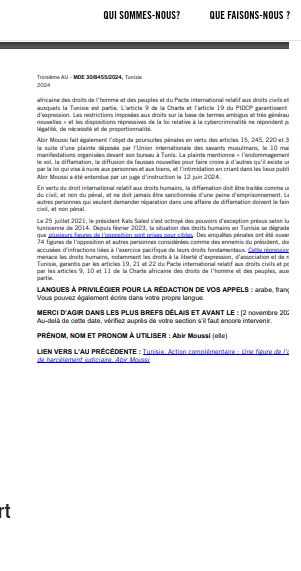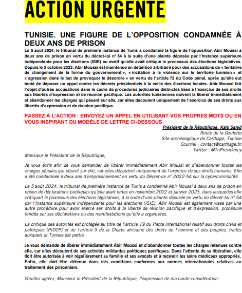 Amnesty International « a adressé une lettre au président de la République tunisienne, Kaïs Saïed,  demandant la libération d’Abir Moussi, actuellement détenue. »