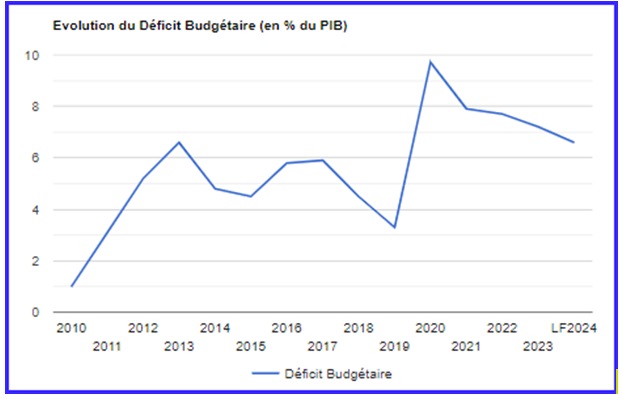 – Tendances : le déficit budgétaire en valeur nominale continue d’augmenter, passant de -10 265 MDT en 2021 à -11 515 MDT prévu dans la Loi de Finances 2024 (LF2024). Toutefois, en pourcentage du PIB, on observe une tendance à la baisse, de -7,9 % en 2021 à -6,6 % prévu en 2024.
