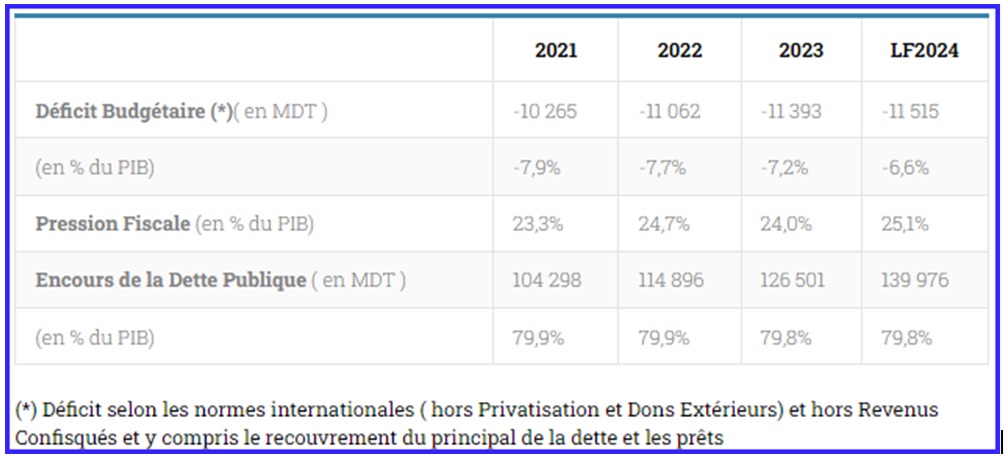 Le tableau ci-dessus, que présente le ministère des Finances, offre un aperçu des tendances clés en matière de déficit budgétaire, de pression fiscale et d’endettement public en Tunisie entre 2021 et 2024. Voici une analyse détaillée des éléments qui ressortent, accompagnée des perspectives économiques pour le pays.