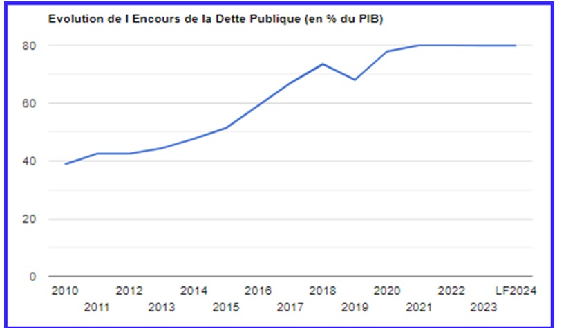 – Analyse : bien que le ratio dette/PIB reste stable, le niveau élevé de la dette publique est préoccupant car il reflète une dépendance accrue aux emprunts pour financer le budget. Le maintien du ratio autour de 80 % du PIB indique une stagnation dans les efforts de réduction de la dette par rapport à la richesse nationale produite.